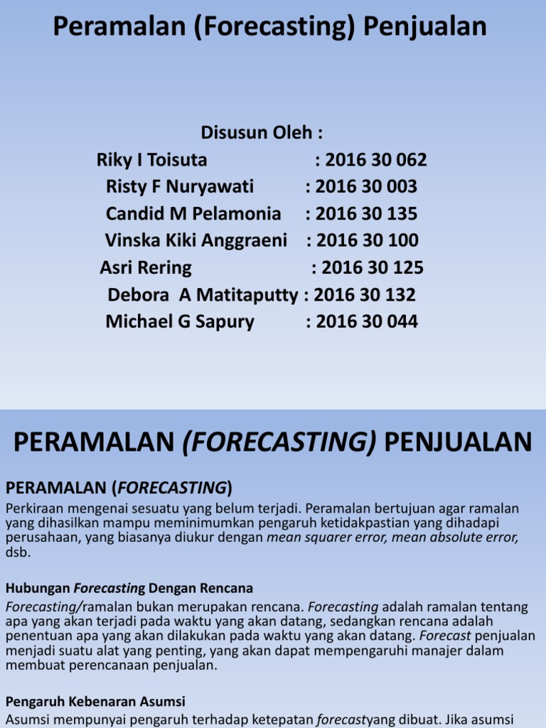 Target, salesplan dan forecast penjualan. Metode peramalan (forecasting method) definisi peramalan peramalan adalah seni dan ilmu untuk memprediksi masa depan. Peramalan (forecasting) statistika dan contoh kasus. Contoh soal anggaran penjualan dan forecasting penjualan beserta analisisnya soal: Peramalan (przewidywanie) merupakan suatu proses perkiraan keadaan pada masa yang akan datang z menggunakan dane di masa lalu (adam dan ebert, 1982).